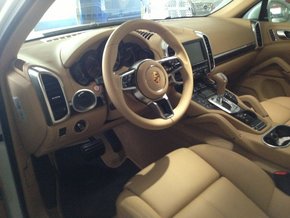 内饰方面:15款美规保时捷卡宴仪表台的真皮包覆显得再自然不过,方向盘线条更加纤细,利用盘幅两侧的滚轮与按键组合,音响、通讯和行车电脑等配备也能轻松进行操作,中间最大的转速表表明它还是一台运动车。