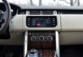 2014款路虎揽胜3.0T行政版大尺寸彩色宽屏占据了中控台的中央位置,两侧的控制按钮改为触摸式,四周被金属饰板包围,路虎做工的精致程度可见一斑。